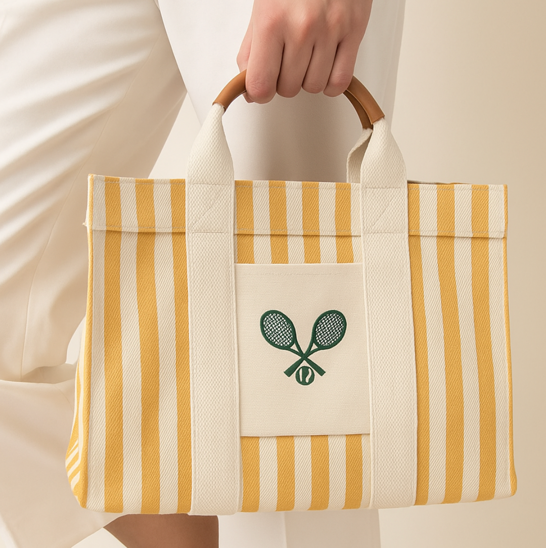 Decidedly summery, the Mini Solis features a striped canvas in sunny tones enhanced with discreet embroidery.